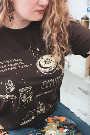 « Mon café d’amour » c’est notre T-shirt symbole qu’on fait partie du club des fières buveuses de café!